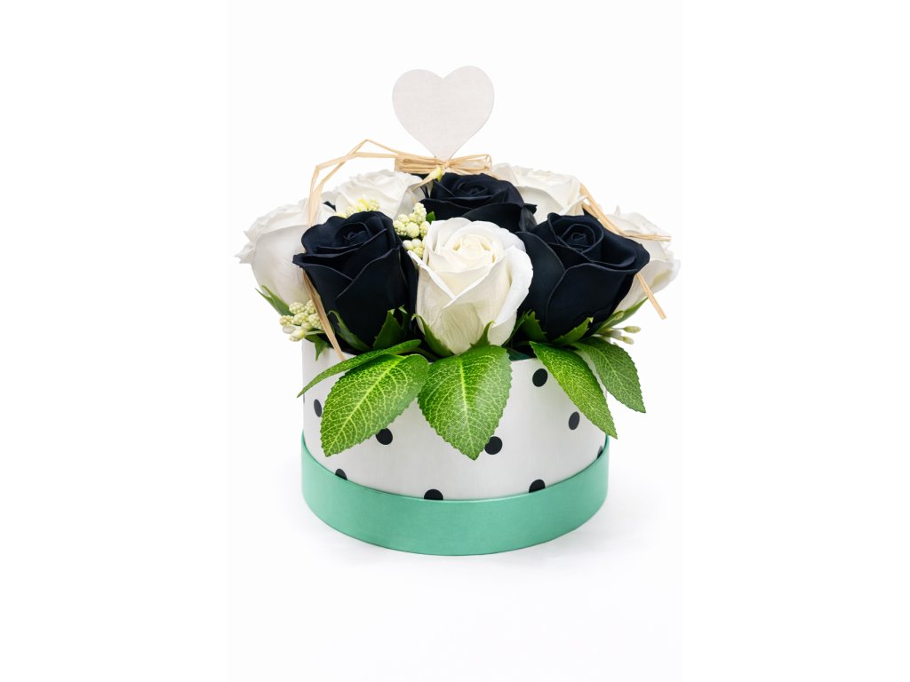 Luxusní květinový box z mýdlových růží v nadčasové kombinaci černé a bílé barvy a je symbolem elegance, kontrastu a výjimečnosti