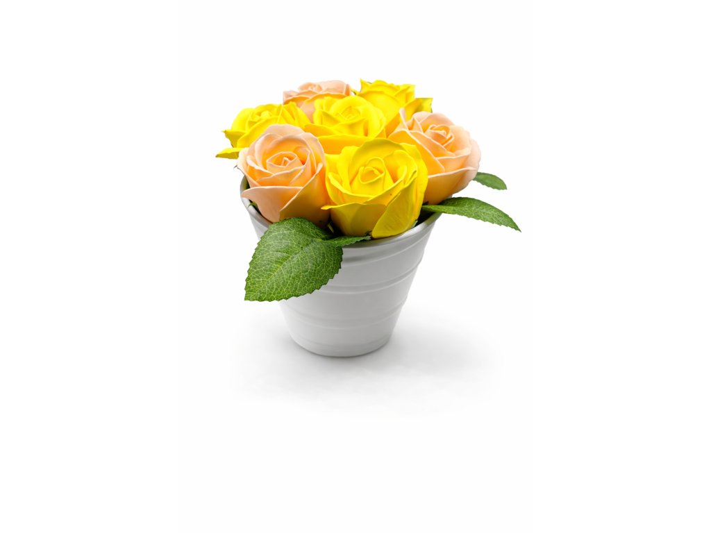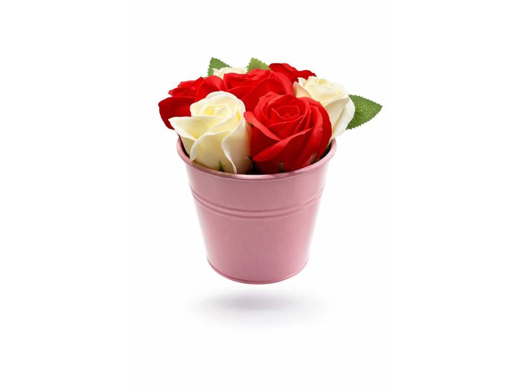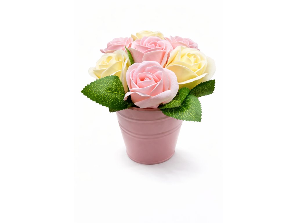 Elegantní kombinace mýdlových květin v růžovém kyblíčku.