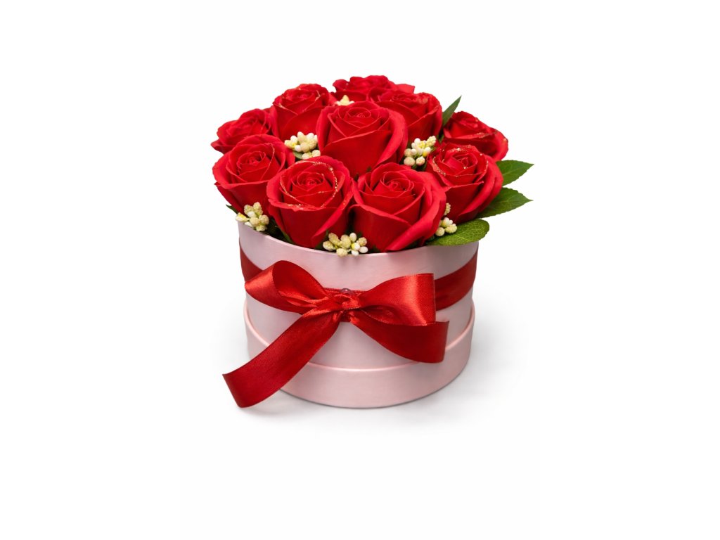 Luxusní flowers box plný sytě červených mýdlových růží, které jsou symbolem lásky, vášně a elegance.