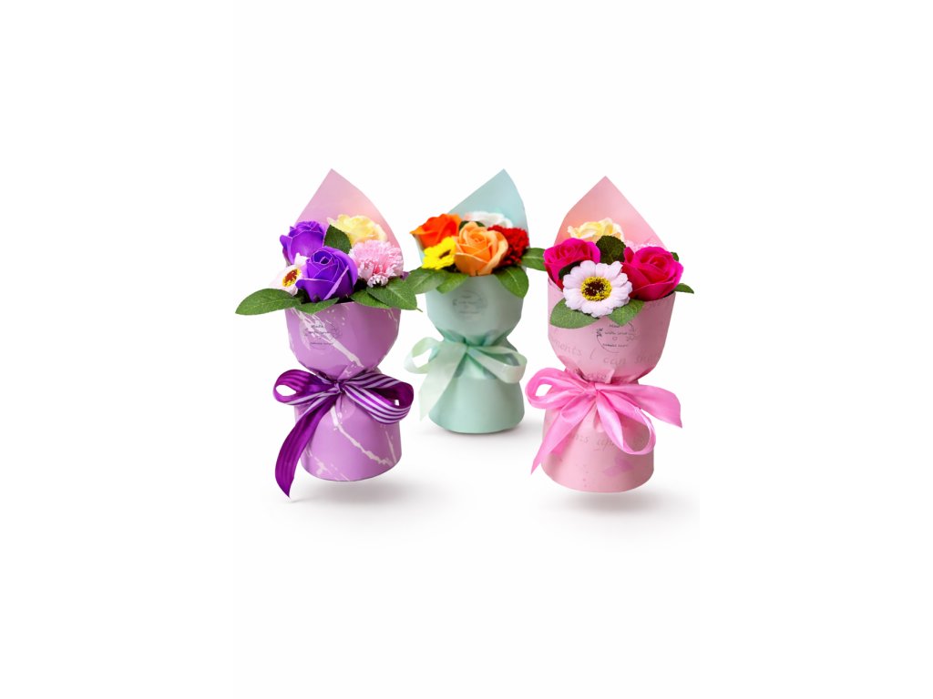 Elegantní drobnost, která potěší na první pohled i na dlouho poté. Jemná kompozice mýdlových květů v něžných tónech je pečlivě naaranžovaná do stylového papírového kornoutku.