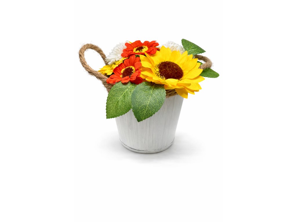 Bílý patinový kyblíček s jemným provázkovým lemem ukrývá krásnou kompozici ve stylu slunečnic - a ano, i ty jsou celé z mýdla! Dokonalá souhra detailů zaručuje, že tato květinová dekorace vynikne v každém interiéru.